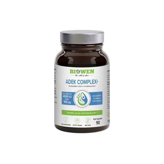 Witaminy ADEK od Biowen to suplement diety, który zawiera wszystkie cztery witaminy rozpuszczalne w tłuszczach, niezbędne dla zdrowia i prawidłowego funkcjonowania organizmu.
